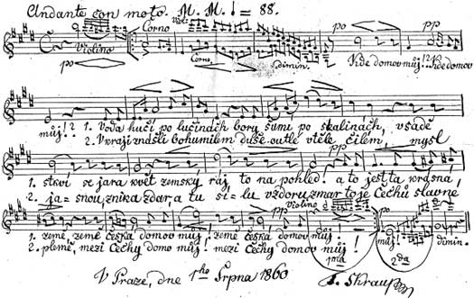 The piece was written as a part of the incidental music to the comedy Fidlovačka aneb Žádný hněv a žádná rvačka (Fidlovačka, or No Anger and No Brawl). It was first performed by Karel Strakatý at the Estates Theatre in Prague on 21 December 1834. The original song consists of two verses (see below). Although J. K. Tyl is said to have considered leaving the song out of the play, not convinced of its quality, it soon became very popular among Czechs and was accepted as an informal anthem of a nation seeking to revive its identity within the Habsburg Monarchy.